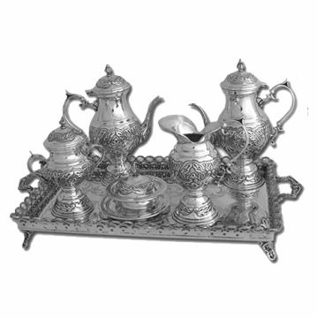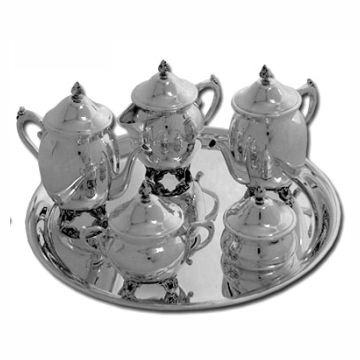 Composto por 2 bules, 1 leiteira, 1 manteigueira e 1 açucareiro, bandeja com 40cm de diâmetro – liso